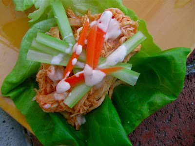 4- To prepare lettuce cups, place 1/2 cup buffalo chicken in each leaf, top with 1/4 cup shredded carrots, celery and dressing of your choice.